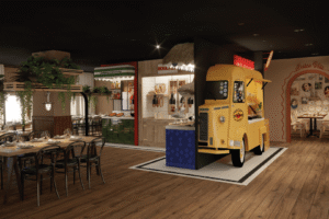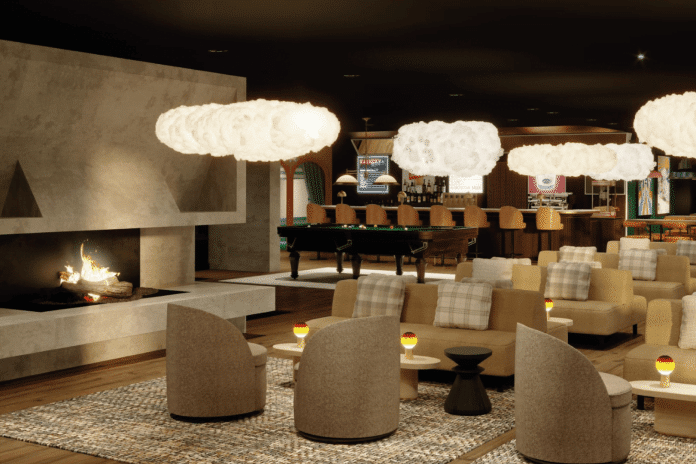 L’aménagement des lieux a été confié à l’architecte d’intérieur Leslie Gauthier, comme pour tous les autres projets du groupe. Elle a imaginé un design qui se veut « loin des clichés de la montagne », tout en s’intégrant parfaitement à l’architecture du bâtiment. « Le bois sera assez présent, mais j’ai aussi intégré des couleurs vives, du mobilier rétro et des éléments de décoration pop, afin de créer une ambiance chic et ludique. D’un espace à l’autre, la décoration sera très différente, afin de ne pas lasser le client. » (…)