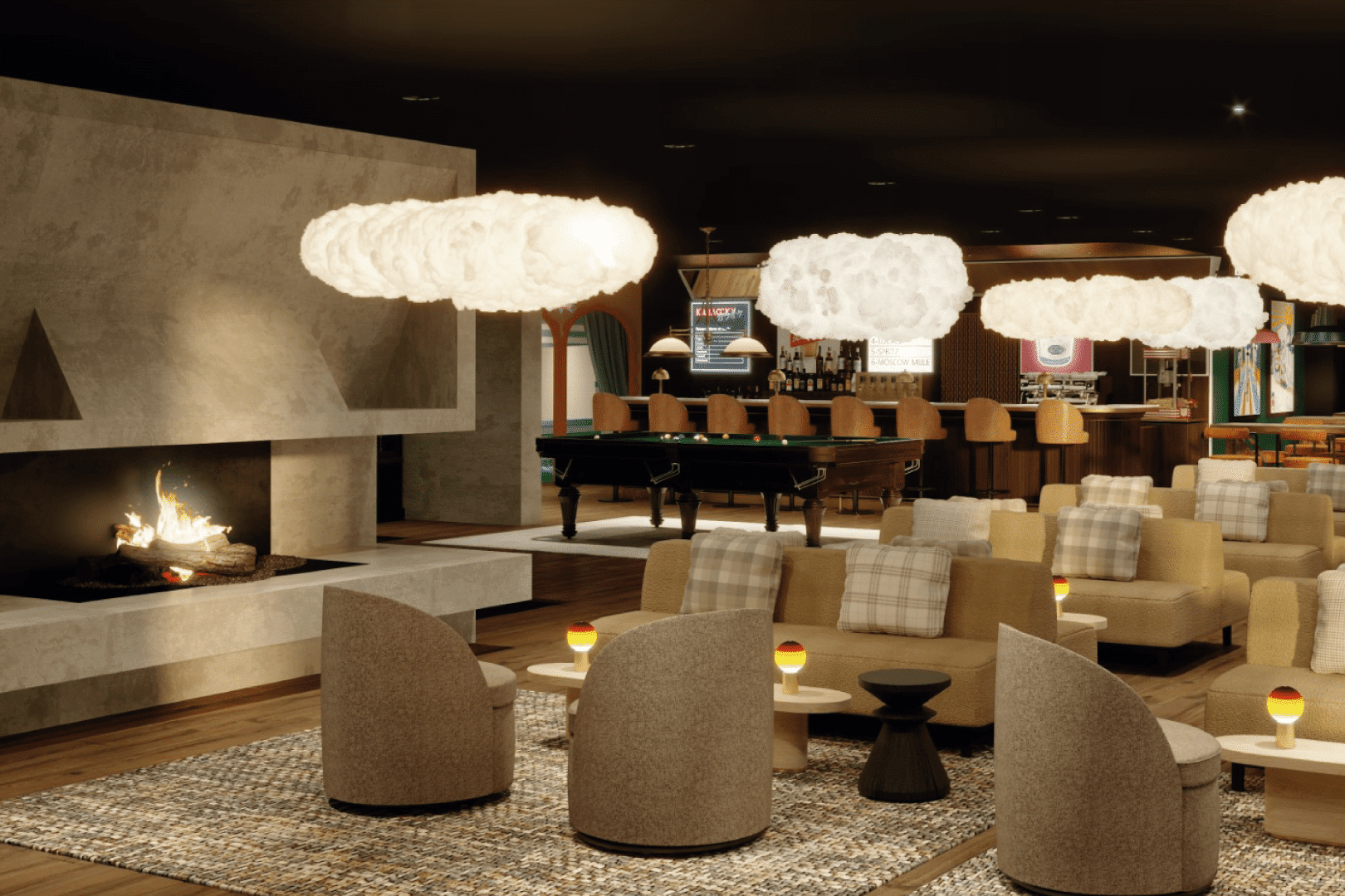 L’aménagement des lieux a été confié à l’architecte d’intérieur Leslie Gauthier, comme pour tous les autres projets du groupe. Elle a imaginé un design qui se veut « loin des clichés de la montagne », tout en s’intégrant parfaitement à l’architecture du bâtiment. « Le bois sera assez présent, mais j’ai aussi intégré des couleurs vives, du mobilier rétro et des éléments de décoration pop, afin de créer une ambiance chic et ludique. D’un espace à l’autre, la décoration sera très différente, afin de ne pas lasser le client. » (…)