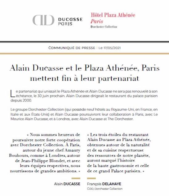 Annoncé par la Tribune de l’Hôtellerie il y a plusieurs semaines, c’est par un communiqué de presse en date du 17 mai 2021 que le groupe Alain Ducasse et le Plaza Athénée officialisent la fin de leur partenariat. Pour mémoire, Alain Ducasse dirigeait depuis 2000 le restaurant du palace parisien.