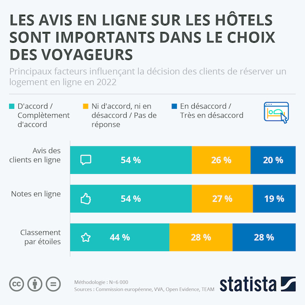 Désormais, dans le monde digital, les consom'acteurs s'appuient sur les avis en ligne et autres applications pour consommer, besoins primaires ou non ! La réservation d'un hôtel, d'un appartement se fait pour plus de la moitié des personnes interrogées, après consultation des avis et évaluations en ligne déposés par les clients ! Harmonisation européenne absente, deux consommateurs européens sur cinq considèrent le classement par étoiles (une à cinq) comme un facteur d'influence lors de la réservation d'une chambre d'hôtel, alors que pour environ un consommateur sur trois, les étoiles ne jouent aucun rôle dans le choix !