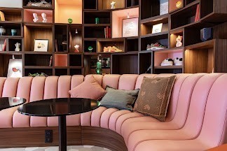 À chaque étage, un artiste attitré habille les couloirs et dans le magnifique lobby d’entrée au voluptueux canapé rose poudre, trônent des objets déco vintage chinés par les maîtres des lieux et des créations de leurs artisans locaux coups de cœur (bougies, illustrations, lampadaires…). Tous ces biens exposés sont en vente, façon concept store.