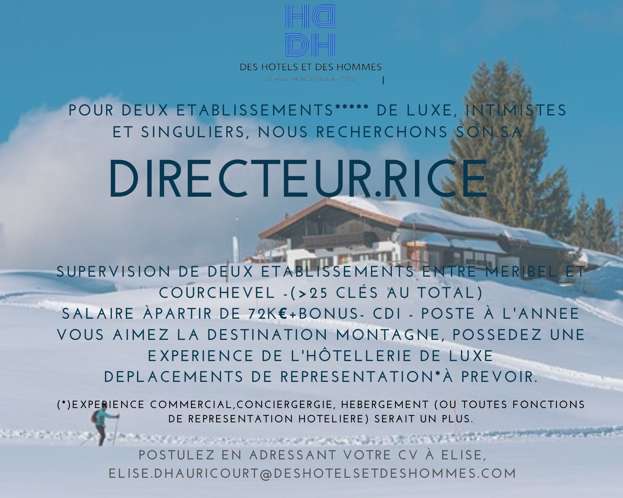 Entre Méribel et Courchevel, devenez ambassadeur.rice d'une marque exceptionnelle ! Expert.e de l'hôtellerie de luxe, vous êtes issu.e du Commercial, de l'hébergement, de toutes fonctions de représentation hôtelière ou Directeur.rice d'hôtel confirmé.e