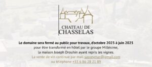 Comme annoncé dans un communiqué du 5 juin 2023 publié par la Maison Joseph Drouhin, le château de Chasselas, murs et vignes avait fait l’objet d’une vente en ‘split’ : les vignes pour la maison beaunoise et les murs pour le groupe bordelais Millésime.