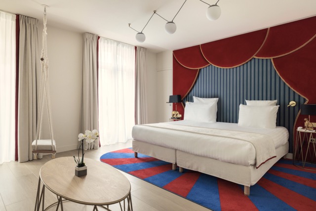 Le cirque Bouglione, c’est la piste aux étoiles ! Il n’en fallait pas moins qu’une entrée des artistes en guise de ciel de lit spectaculaire. A cet habillage en velours molletonné et galon or s’ajoutent un tapis rouge et bleu, des chevets singeant le piédestal des éléphants, tandis que des balançoires viennent théâtraliser encore un peu plus certaines chambres…