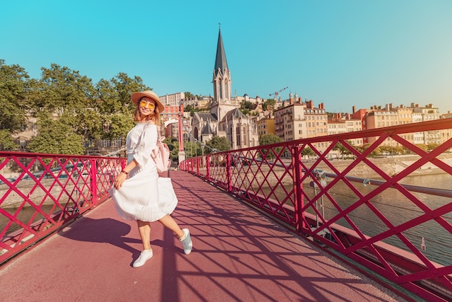 Happy girl traveler and tourist walks through the center of Lyon's old town and enjoys the view of Eglise Saint Georges Church on the banks of the Saone river